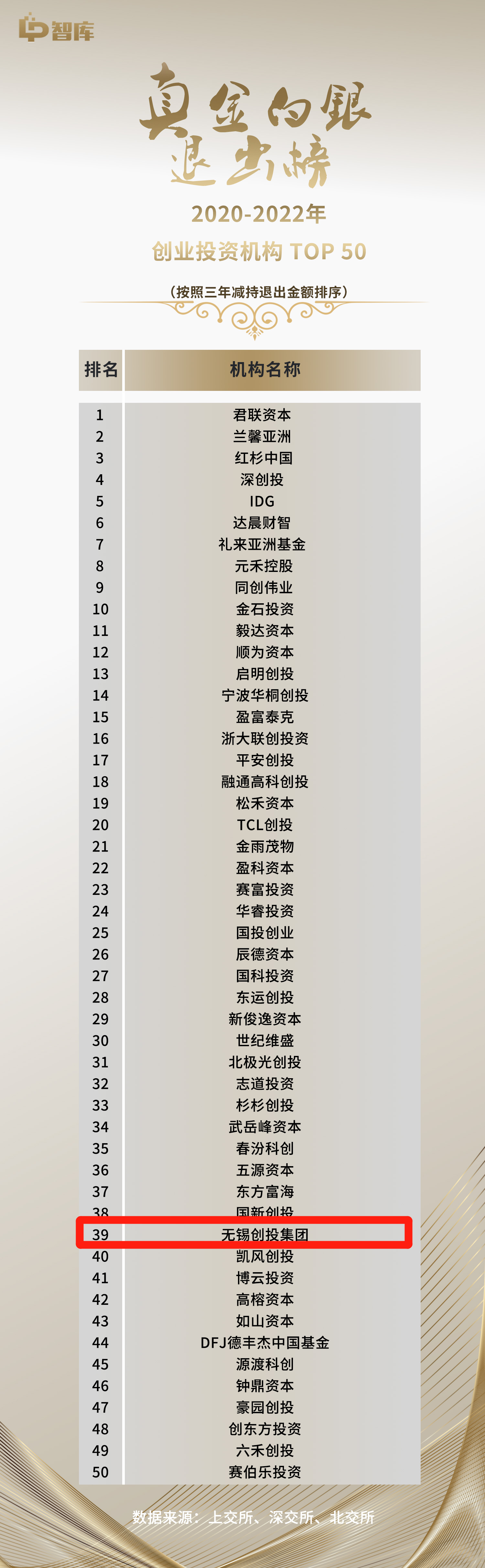 | 創(chuàng)投集團(tuán)榮獲《真金白銀退出榜》2020-2022年創(chuàng)業(yè)投資機(jī)構(gòu)TOP50榜第39名 |